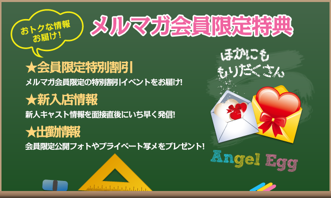 天使のたまごのメールマガジンです。メールマガジンにしかない女の子の色々な情報から、お得な割引情報が満載ですよ。解除の方も簡単に出来ますので、お気軽にご利用くださいませ。